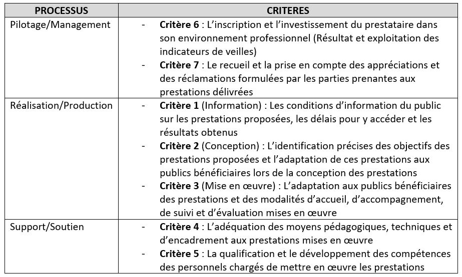 La répartition des critères Qualiopi par rapport aux 3 types de processus